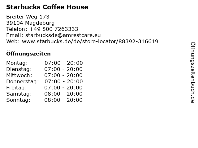 | Öffnungszeiten Starbucks Coffee House in Magdeburg anzeigen | |