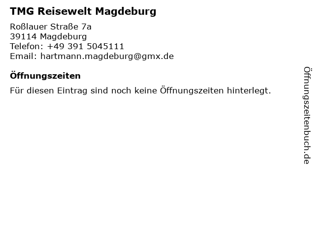 | Öffnungszeiten TMG Reisewelt Magdeburg in Magdeburg anzeigen | |