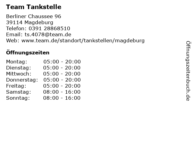 | Öffnungszeiten Team Tankstelle in Magdeburg anzeigen | |
