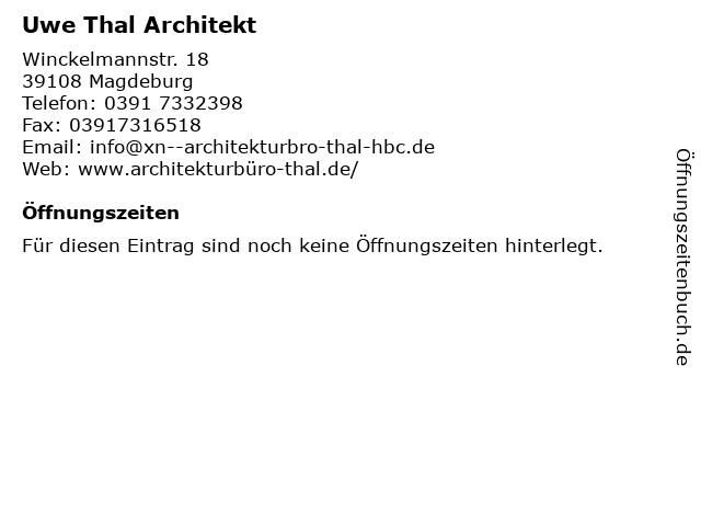 | Öffnungszeiten Uwe Thal Architekt in Magdeburg anzeigen | |