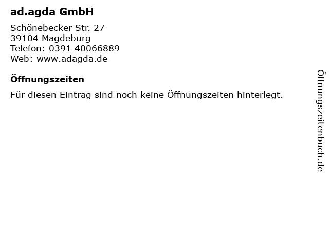 | Öffnungszeiten ad.agda GmbH in Magdeburg anzeigen | |