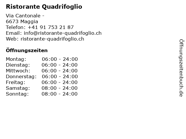 | Öffnungszeiten Ristorante Quadrifoglio in Maggia anzeigen | |