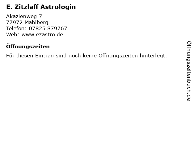 | Öffnungszeiten E. Zitzlaff Astrologin in Mahlberg anzeigen | |