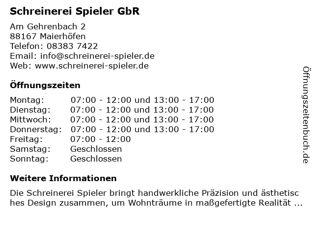 | Öffnungszeiten Schreinerei Spieler GbR in Maierhöfen anzeigen | |