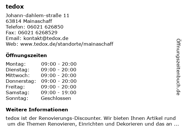 | Öffnungszeiten tedox in Mainaschaff anzeigen | |