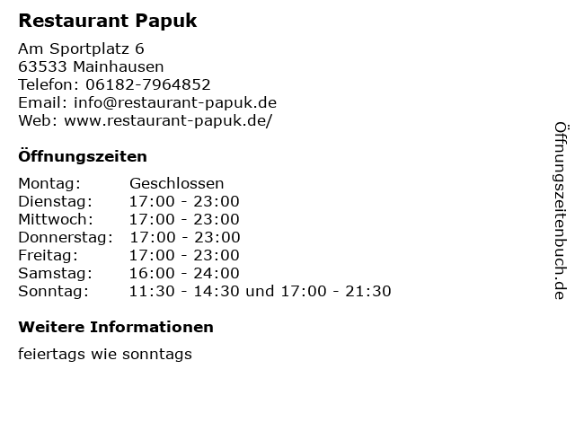 | Öffnungszeiten Restaurant Papuk in Mainhausen anzeigen | |