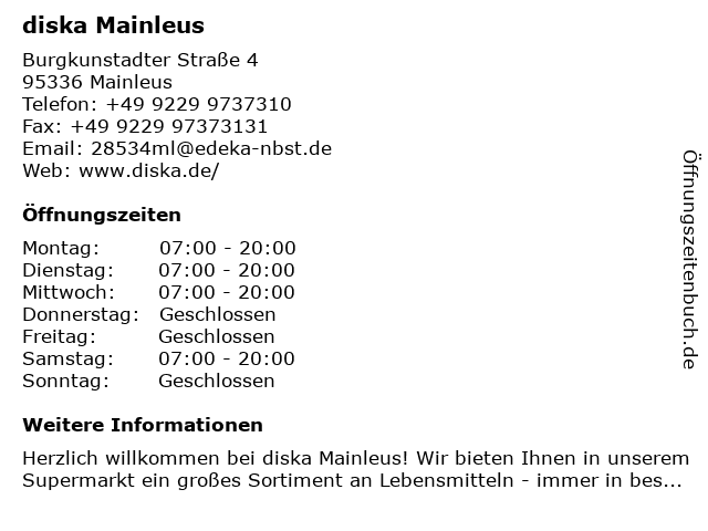 | Öffnungszeiten diska Mainleus in Mainleus anzeigen | |