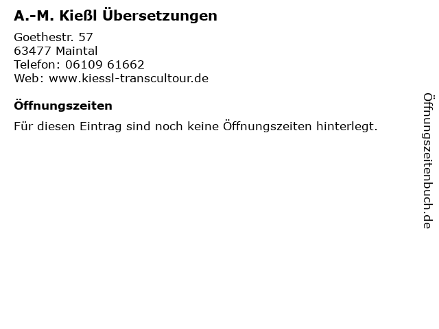 | Öffnungszeiten A.-M. Kießl Übersetzungen in Maintal anzeigen | |
