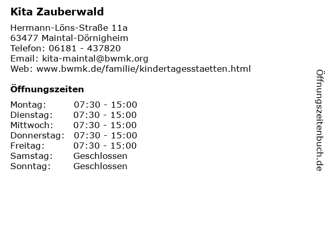 | Öffnungszeiten Kita Zauberwald in Maintal-Dörnigheim anzeigen | |