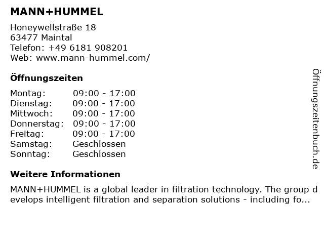 | Öffnungszeiten MANN+HUMMEL in Maintal anzeigen | |