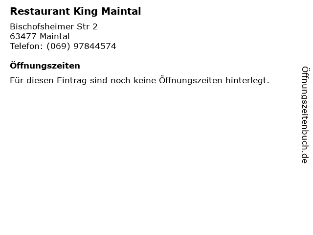 | Öffnungszeiten Restaurant King Maintal in Maintal anzeigen | |
