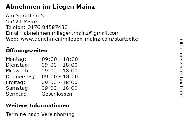 | Öffnungszeiten Abnehmen im Liegen Mainz in Mainz anzeigen | |