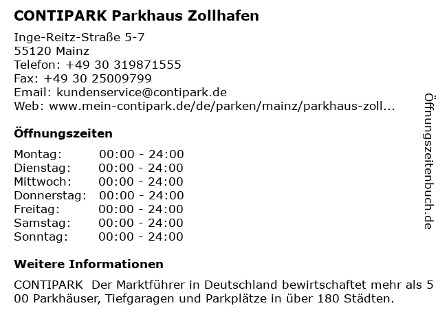 | Öffnungszeiten CONTIPARK Parkhaus Zollhafen in Mainz anzeigen | |
