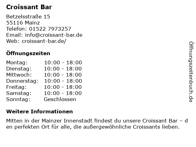 | Öffnungszeiten Croissant Bar in Mainz anzeigen | |