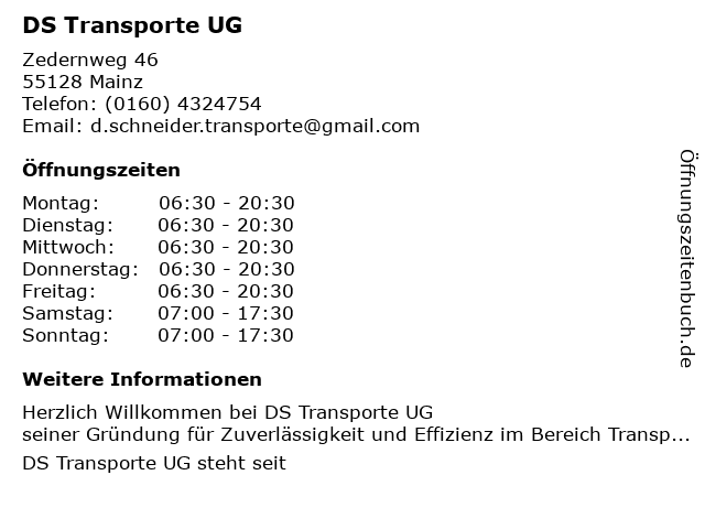 | Öffnungszeiten DS Transporte UG in Mainz anzeigen | |