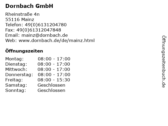 | Öffnungszeiten Dornbach GmbH in Mainz anzeigen | |