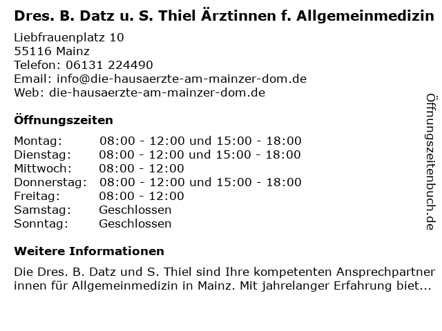1 Gemeinschaftspraxis, Dr. med. Thiel & Dr. med. Datz (Entfernung: 0,00 km) Liebfrauenstraße 10, 55116 Mainz 5 Gemeinschaftspraxis Schmerz- und Palliativzentrum Dres. Thomas Nolte Mechthilde Burst Liliana Tarau u.w. (Entfernung: 8,63 km) Langenbeckplatz 2, 65189 Wiesbaden 6 HNO- Gemeinschaftspraxis Götz Frank Dres. Hettler Höfken Furtmann (Entfernung: 9,25 km) An der Ringkirche 4, 65197 Wiesbaden |