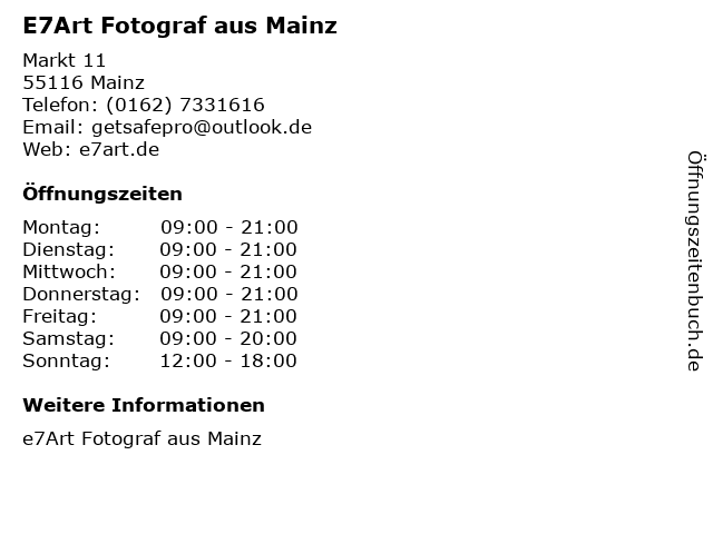 Öffnungszeiten E7Art Fotograf aus Mainz in Mainz anzeigen | |