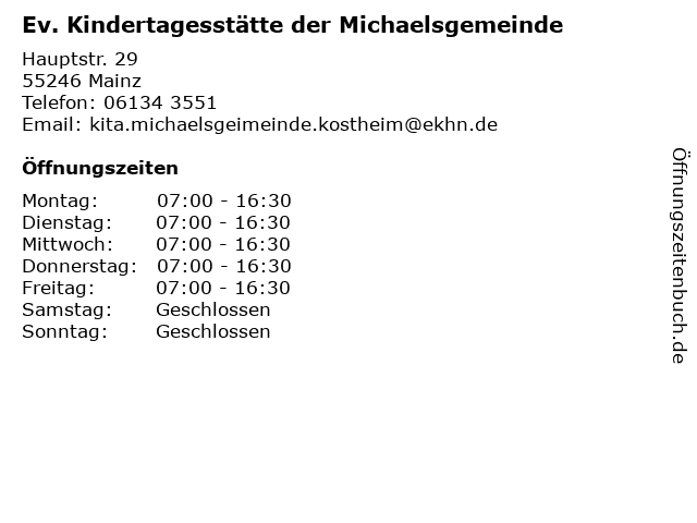 1 Gemeindebüro Evangelische Michaelsgemeinde Mainz-Kostheim (Entfernung: 0,00 km) Hauptstraße 29, 55246 Mainz 2 Evangelische Michaelskirche Mainz-Kostheim - Evangelische Michaelsgemeinde Mainz-Kostheim (Entfernung: 0,00 km) Hauptstraße 31, 55246 Mainz 4 Michaelsgemeinde Gemeindebüro Pfarrer Thomas Waldeck (Entfernung: 28,13 km) Mollerstr. 23, 64289 Darmstadt 6 Ev. Kindertagesstätte der Michaelsgemeinde, Kinderhort (Entfernung: 28,21 km) Liebfrauenstraße 10, 64289 Darmstadt |