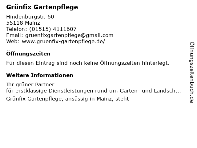| Öffnungszeiten Grünfix Gartenpflege in Mainz anzeigen | |
