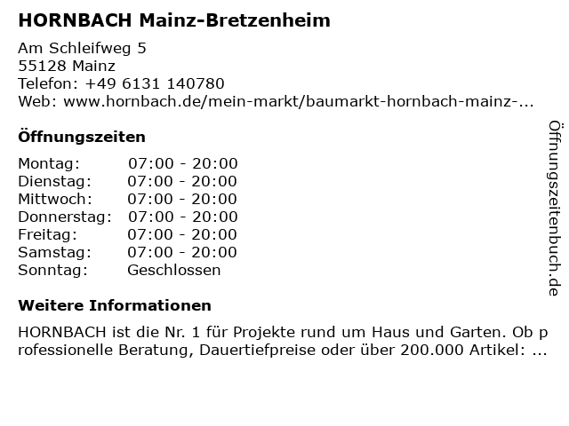 Öffnungszeiten HORNBACH Mainz-Bretzenheim in Mainz anzeigen | |
