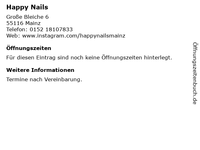 | Öffnungszeiten Happy Nails in Mainz anzeigen | |