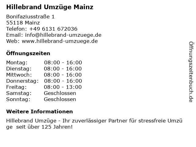 | Öffnungszeiten Hillebrand Umzüge Mainz in Mainz anzeigen | |