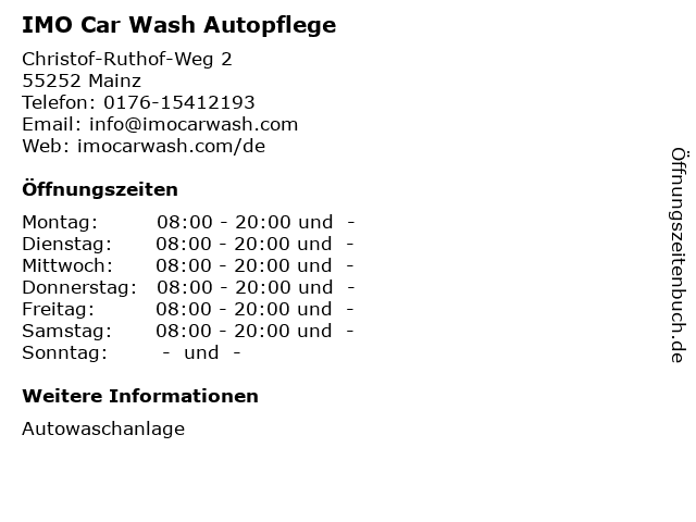 | Öffnungszeiten IMO Car Wash Autopflege in Mainz anzeigen | |