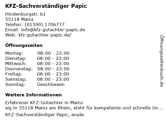 | Öffnungszeiten KFZ-Sachverständiger Papic in Mainz anzeigen | |