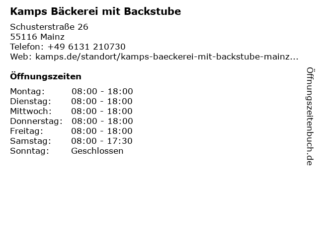 | Öffnungszeiten Kamps Bäckerei mit Backstube in Mainz anzeigen | |