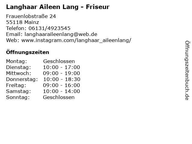 | Öffnungszeiten Langhaar Aileen Lang - Friseur in Mainz anzeigen | |