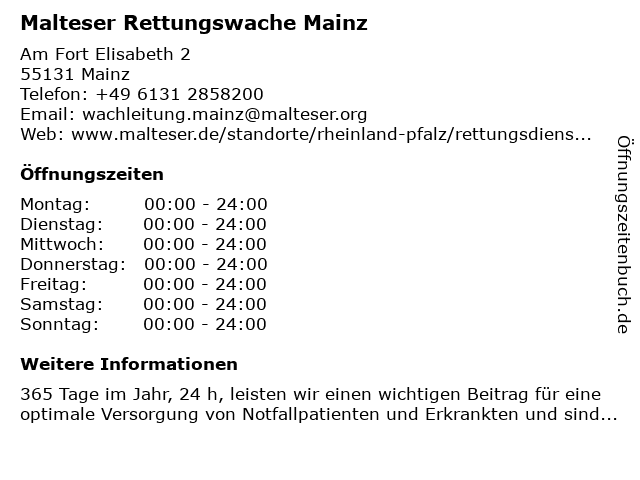 | Öffnungszeiten Malteser Rettungswache Mainz in Mainz anzeigen | |