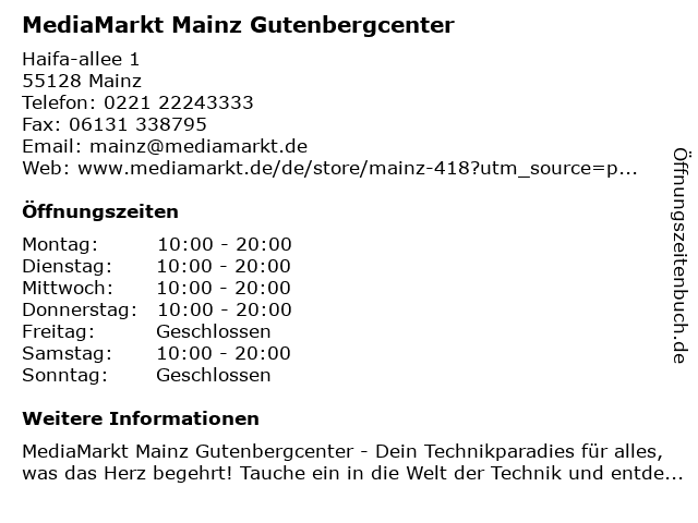 Branchen & Suchbegriffe zu MediaMarkt Mainz Gutenbergcenter:anbieter für telekommunikationsgeräte, computergeschäft, geschäft für handyzubehör, geschäft für heimaudiosysteme, geschäft für videospiele, gutenbergcenter, handyreparaturgeschäft, haushaltsgeräte, mediamarkt, mobiltelefongeschäft |