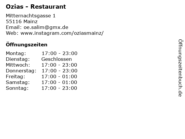 | Öffnungszeiten Ozias - Restaurant in Mainz anzeigen | |