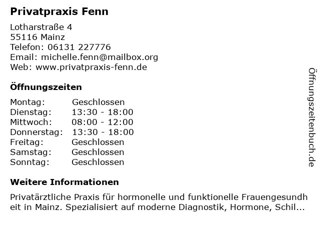 | Öffnungszeiten Privatpraxis Fenn in Mainz anzeigen | |