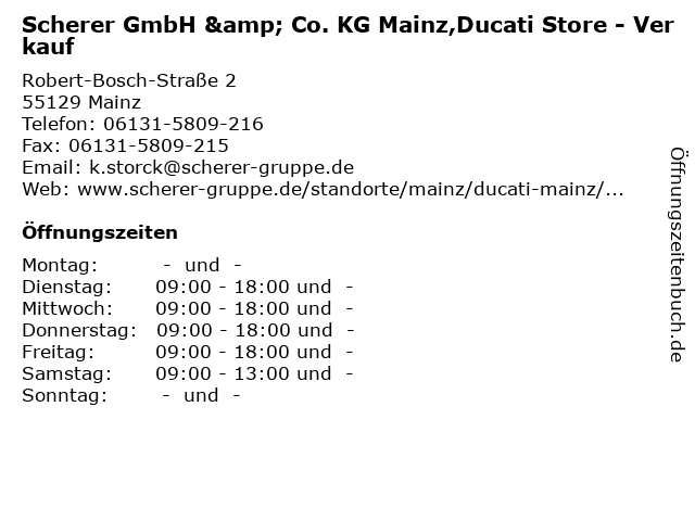 1 Scherer GmbH & Co. KG Mainz,Ducati Store - Service (Entfernung: 0,00 km) Robert-Bosch-Straße 2, 55129 Mainz 6 |