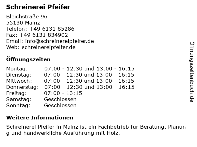 | Öffnungszeiten Schreinerei Pfeifer in Mainz anzeigen | |
