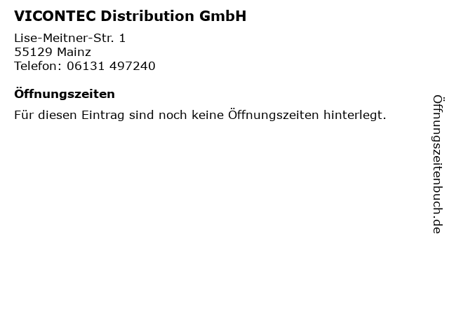 | Öffnungszeiten VICONTEC Distribution GmbH in Mainz anzeigen | |