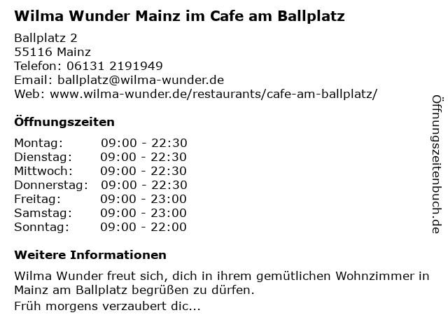 Branchen & Suchbegriffe zu Wilma Wunder Mainz im Cafe am Ballplatz:ballplatz, cafe, café, frühstückslokal, wilma, wunder |