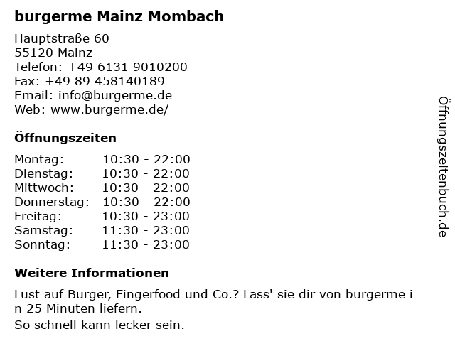 | Öffnungszeiten burgerme Mainz Mombach in Mainz anzeigen | |