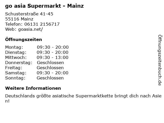 | Öffnungszeiten go asia Supermarkt - Mainz in Mainz anzeigen | |