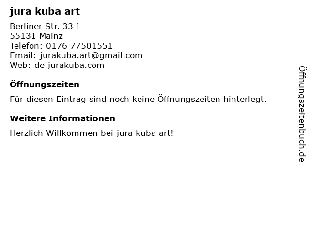 | Öffnungszeiten jura kuba art in Mainz anzeigen | |