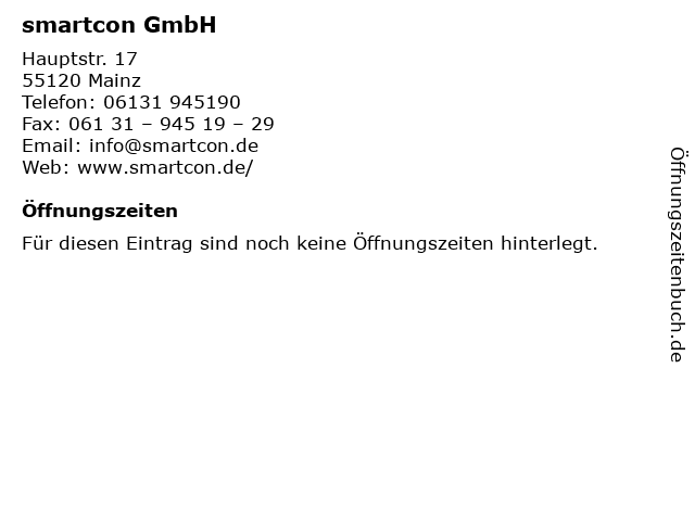 | Öffnungszeiten smartcon GmbH in Mainz anzeigen | |