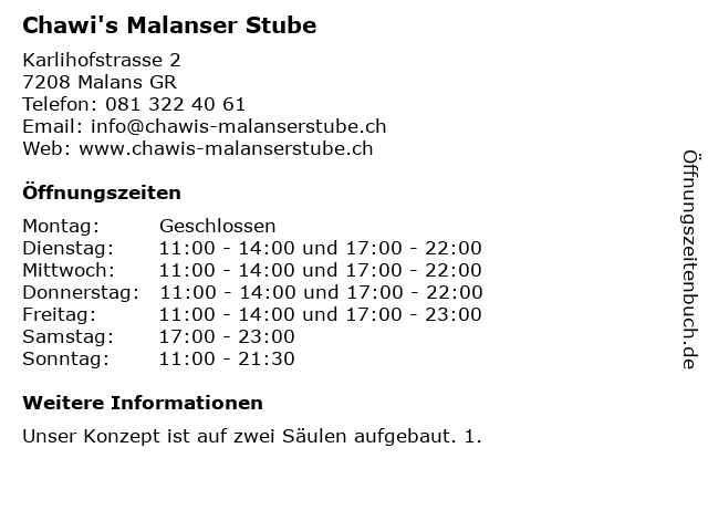 | Öffnungszeiten Chawi's Malanser Stube in Malans GR anzeigen | |
