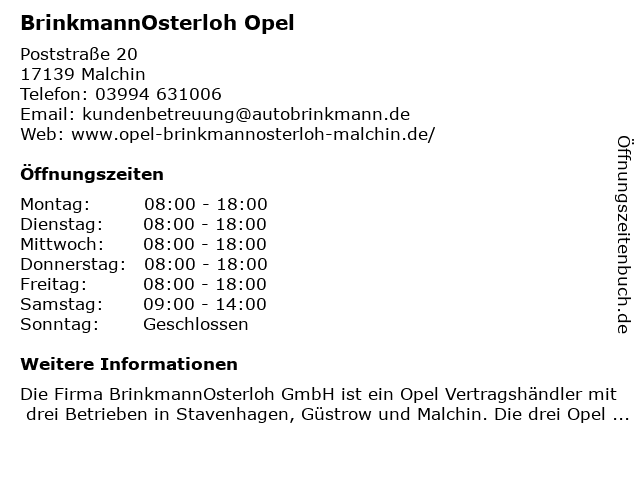 | Öffnungszeiten BrinkmannOsterloh Opel in Malchin anzeigen | |