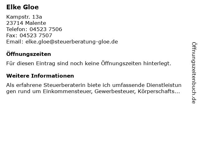 | Öffnungszeiten Elke Gloe in Malente anzeigen | |