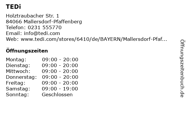 | Öffnungszeiten TEDi in Mallersdorf-Pfaffenberg anzeigen | |