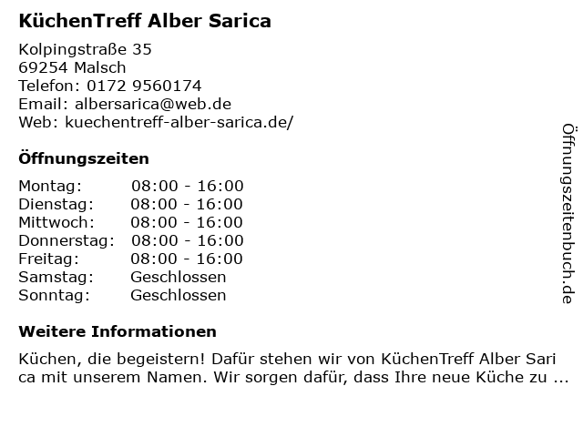 | Öffnungszeiten KüchenTreff Alber Sarica in Malsch anzeigen | |