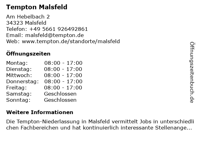 | Öffnungszeiten Tempton Malsfeld in Malsfeld anzeigen | |