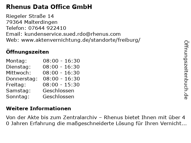 | Öffnungszeiten Rhenus Data Office GmbH in Malterdingen anzeigen | |